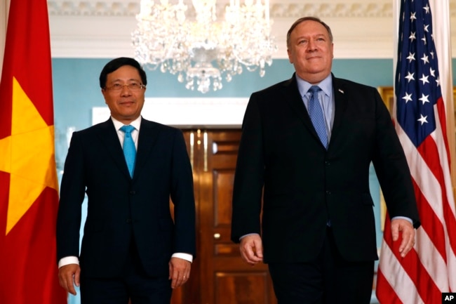 | Ngoại trưởng Mỹ Pompeo gặp Phó Thủ tướng-Bộ trưởng Ngoại giao VN Phạm Bình Minh ở Mỹ, tháng 5/2019 |